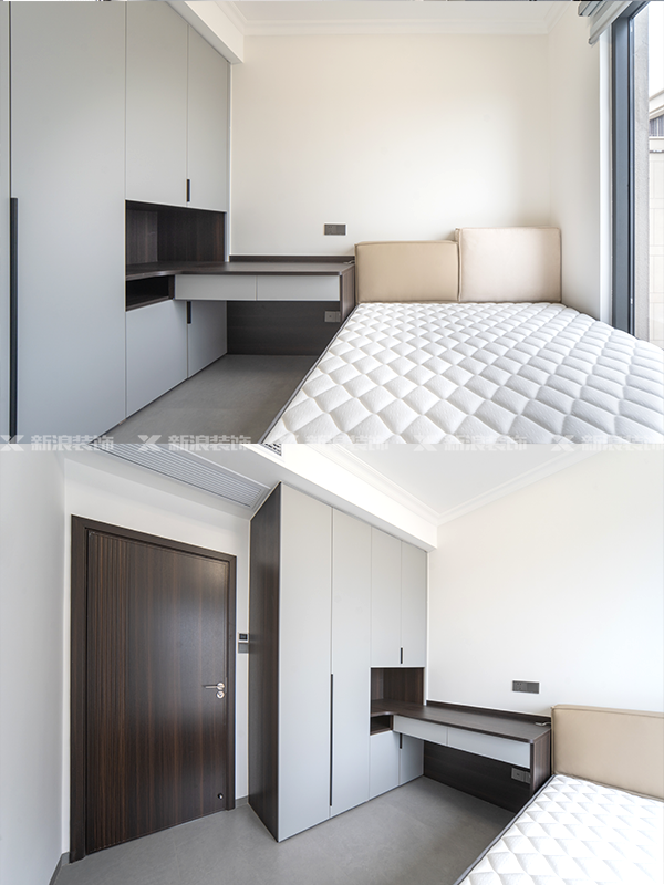 主臥床尾做上滿墻衣柜,一門到頂+無拉手設(shè)計,美觀又大氣,收納空間超大!