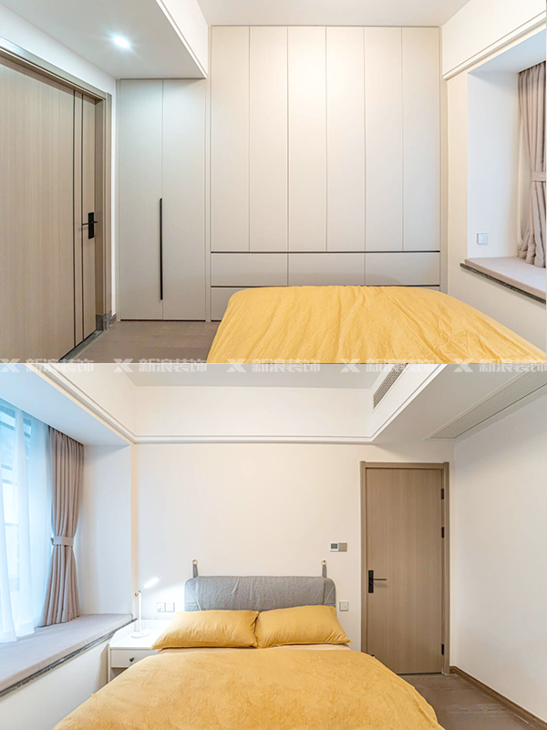 臥室衣柜做床尾空間,分段+無拉手結(jié)構(gòu)設(shè)計(jì),下方做抽屜收納小衣物,上方主要做掛衣區(qū)和被褥區(qū)
