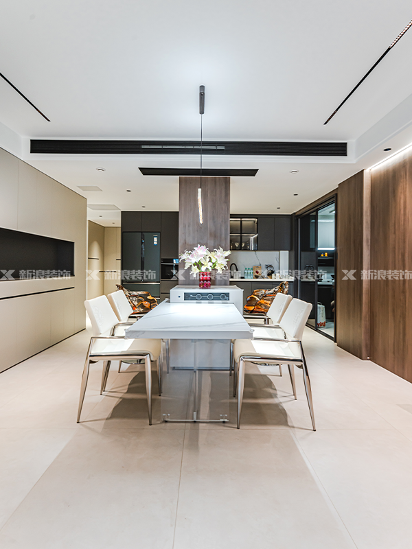 客餐廳做無(wú)主燈吊頂,筒燈+線燈實(shí)現(xiàn)了視線的延伸,放大了戶型的縱深感。