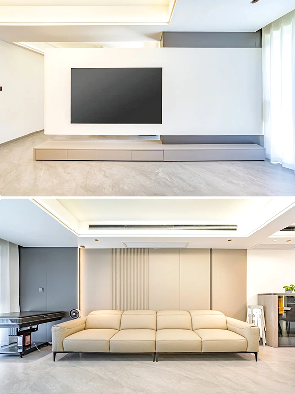 客廳和開放式書房聯(lián)通,用懸浮電視背景做功能分區(qū),空間通透又有獨(dú)立感。