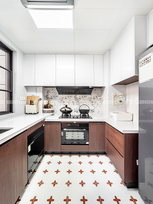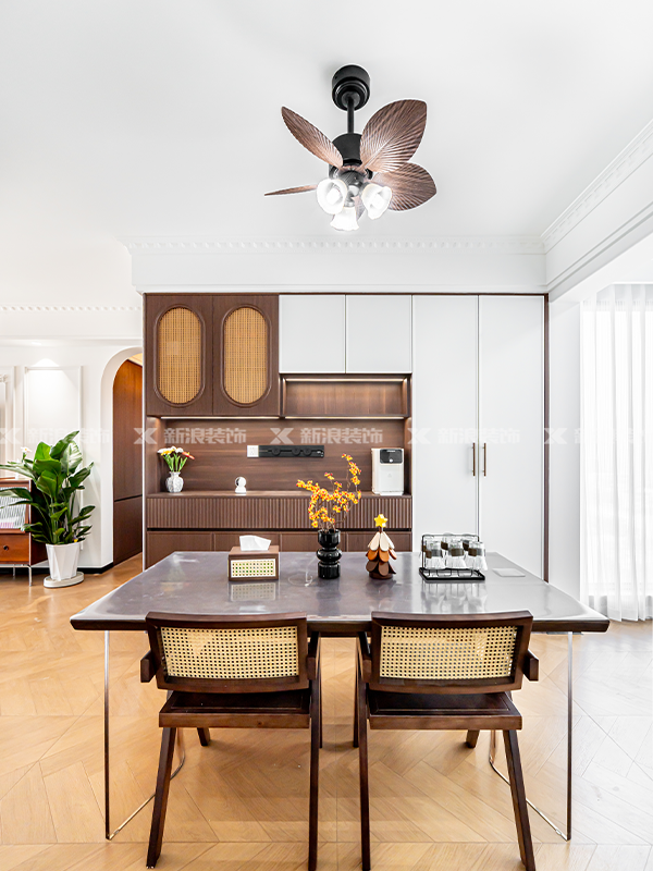 ?? 書房、廚衛(wèi)善用黑框造型玻璃推拉門,定制柜做胡桃木色,部分空間做藤編柜門,高端定制同色同造型真的超美!