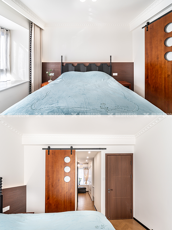 ?? 地面木紋磚通鋪,部分墻面做半墻木飾面造型,顏色過度自然,空間不壓抑。