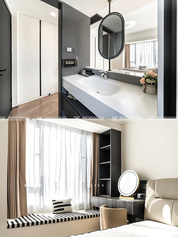 主臥做半開放式套間設計,洗漱干區(qū)+梳妝臺一體設計,加上床尾滿墻衣柜,空間充分利用!