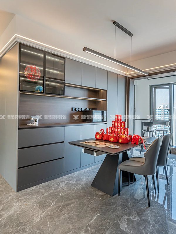 新浪裝飾,麗爾曼頓,長(zhǎng)沙裝修,實(shí)景落地,現(xiàn)代風(fēng)格設(shè)計(jì),裝修實(shí)景案例,裝修風(fēng)格,客餐廳一體化,暗黑色裝修,毛坯裝修