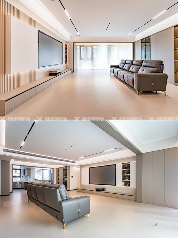 懸浮電視柜+格柵打底:懸浮電視柜,搭配木紋格柵背景,層次感瞬間提升,極簡中透出高級