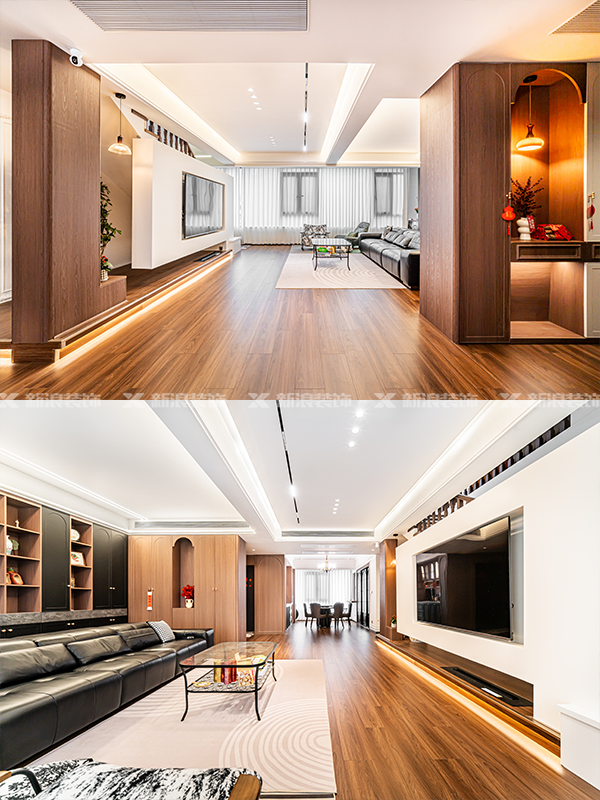 ? 電視背景墻:白色簡(jiǎn)約懸浮+棕色地臺(tái)點(diǎn)綴,內(nèi)嵌暖光燈帶