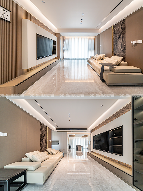 全屋無主燈設計,磁吸軌道燈+射燈組合,氛圍感拿捏!嵌入式懸浮電視柜+護墻板,極簡不積灰,空間質感upup!