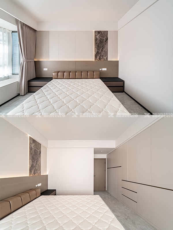 沙發(fā)背景&主臥背景墻用巖板小面積點綴,天然紋理搭配燈光,視覺中心的 C位!輕奢不浮夸,細節(jié)控狂喜~
