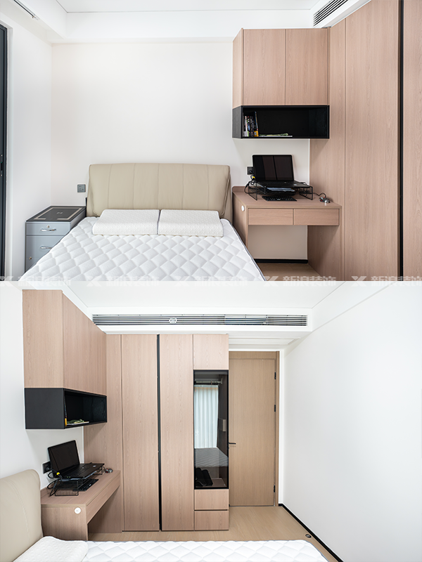 整體配色是黑白木色,搭配暖色漆,強調(diào)極致收納和空間放大