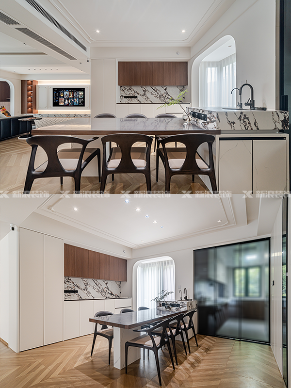 餐廳餐島臺:大理石臺面搭配胡桃木柜體和黑色金屬元素,精致又實用!早餐臺、收納柜、社交區(qū)三合一,誰看了不夸一句高級感爆棚
