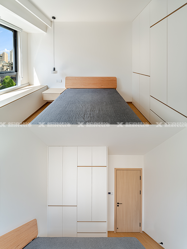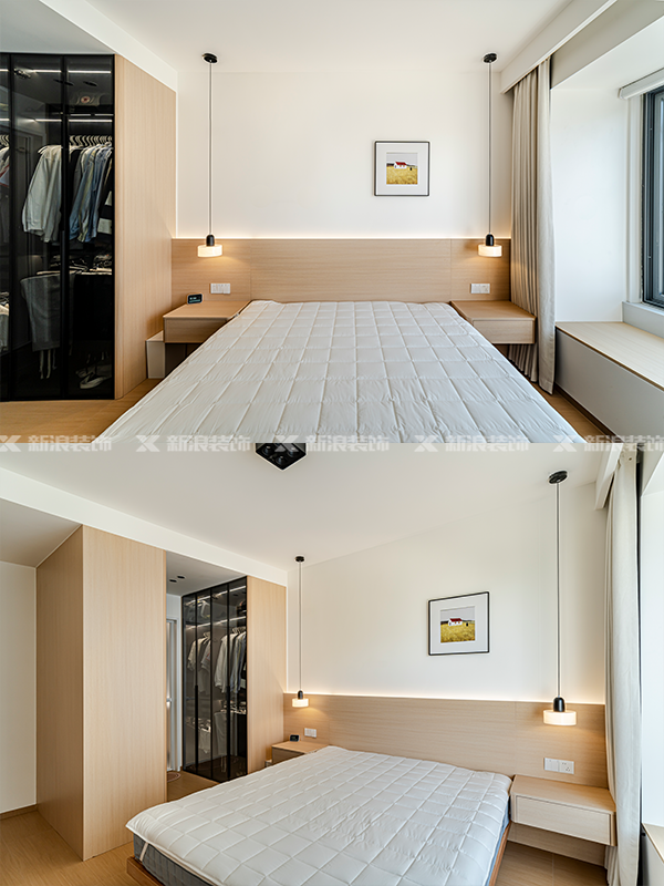 臥室同色原木床頭背景,不做石膏線
